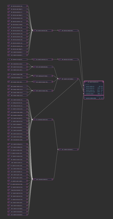 The image below illustrates this complexity using a secondary dataset model graph for an electricity market. Just three levels down, the number of processes becomes unwieldy — and this is for a single input in a single product.
