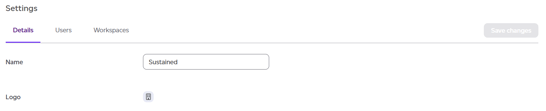 - You will land on settings page showing the details of the company. Here you can change the company name if you wish to, or you can access the users or workspaces tab. Click on 'Workspaces'.